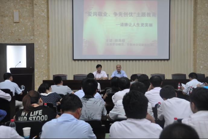 8月11日下午,結(jié)合集團(tuán)“愛崗敬業(yè)、爭(zhēng)先創(chuàng)先”主題教育活動(dòng),供水公司邀請(qǐng)全國(guó)勞動(dòng)模范、紹興市制水公司副總經(jīng)理徐海根為公司班組長(zhǎng)以上管理干部作題為《道德讓人生更美麗》的宣講教育,共80余人聆聽了模范的精彩宣講。會(huì)上,徐海根結(jié)合自身工作實(shí)際,用樸實(shí)的語(yǔ)言講述了孝心、愛心、誠(chéng)心、責(zé)任心在工作中的重要性與必要性,鮮活生動(dòng)的感人故事催人奮進(jìn)。與會(huì)的每個(gè)人在這里接受了一次心靈的洗禮,取得較好的效果。