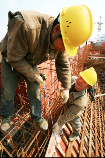 (圖為一體化生物反應(yīng)池建設(shè)工地上工人們在7米多高的腳架上搭建混凝土澆筑夾板。)