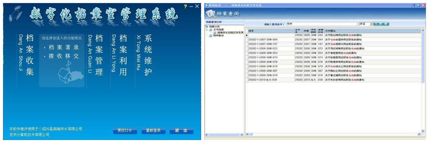 今年年初以來(lái),在縣檔案局指導(dǎo)下,濱海供水公司檔案工作有了較大提高,數(shù)字檔案室建設(shè)基礎(chǔ)良好,軟、硬件條件完善,達(dá)到檔案信息數(shù)字化標(biāo)準(zhǔn)。目前,檔案室建有文書(shū)、會(huì)計(jì)、用戶(hù)、工程、人事、設(shè)備、聲像等7大類(lèi)電子檔案數(shù)據(jù)庫(kù)及供水管網(wǎng)信息、綜合水供水信息、小舜江供水信息、綜合水用戶(hù)信息、大事記、組織機(jī)構(gòu)沿革等6個(gè)專(zhuān)題數(shù)據(jù)庫(kù),歸檔電子文件達(dá)20995件。同時(shí),開(kāi)通電子檔案信息查詢(xún)平臺(tái),并與辦公自動(dòng)化系統(tǒng)實(shí)現(xiàn)聯(lián)通,可隨時(shí)訪(fǎng)問(wèn)利用電子檔案信息,進(jìn)一步提升了供水信息化程度,提高了檔案服務(wù)能力。
