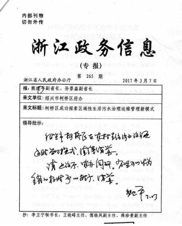3月7日,浙江省副省長熊建平對《柯橋區(qū)成功探索區(qū)域性生活污水治理運維管理新模式》進行批示,認為柯橋區(qū)在城鄉(xiāng)生活污水治理運維管理模式值得借鑒,部分經(jīng)驗可以作為全省的標(biāo)準(zhǔn)予以推廣、借鑒。