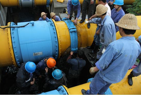 當時,工作人員正在現(xiàn)場巡視,實然發(fā)現(xiàn)市排DN800管道流量計后硬性伸縮節(jié)滲漏噴水,于是立即按照報告制度進行匯報,該公司立即啟動應急預案。搶修分兩路展開,一隊人員用應急水泵,將滲漏的污水打入生產(chǎn)系統(tǒng)中;另一隊人員對滲漏點進行檢查,確定是因硬性伸縮節(jié)的兩顆螺絲膨脹后崩斷造成爆管。在通知排水公司對進廠流量進行控制的同時,現(xiàn)場搶修指揮人員立即組織維修人員對硬性伸縮節(jié)進行更換。維修人員在采取相關安全措施后,冒著不斷噴出的污水,立刻進行拆裝螺栓作業(yè)。隨著水流一點點變小,漏點最終被徹底控制。
