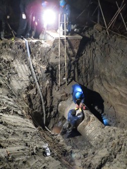 11月23日,濱海北側(cè)泵站DN500進(jìn)水管多處斷裂,導(dǎo)致濱海興濱路華納藥業(yè)門(mén)口的綠化帶上出現(xiàn)了一條長(zhǎng)50米,寬3米深1米的溝壑,情況十分危險(xiǎn)。維修分公司立即組織人員趕赴現(xiàn)場(chǎng)勘察,面對(duì)路面濕滑結(jié)冰;高壓電線(xiàn)、水管光纜錯(cuò)綜復(fù)雜;管道破損區(qū)域廣、埋藏深度深等困難,維修員們?cè)绯鐾須w,每天工作12小時(shí),歷時(shí)17天,修復(fù)管道一百三十余米,終于在12月8日,順利完成濱海興濱路DN500管搶修工作。