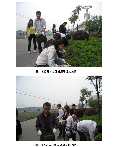 為美化城市環(huán)境迎接第六屆世界合唱比賽,同時也為“五四”青年節(jié)及建團(tuán)八十八周年獻(xiàn)禮,5月8日下午,供水公司團(tuán)總支組織青年志愿者進(jìn)行了一場義務(wù)勞動,對柯湖路的垃圾進(jìn)行了清理。